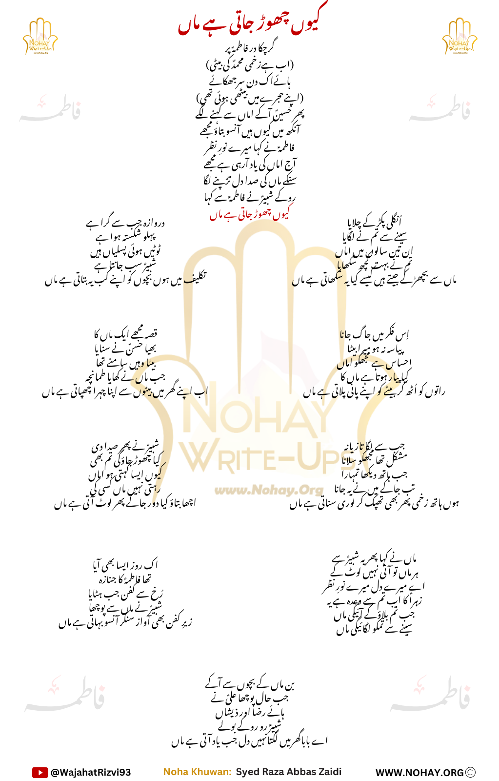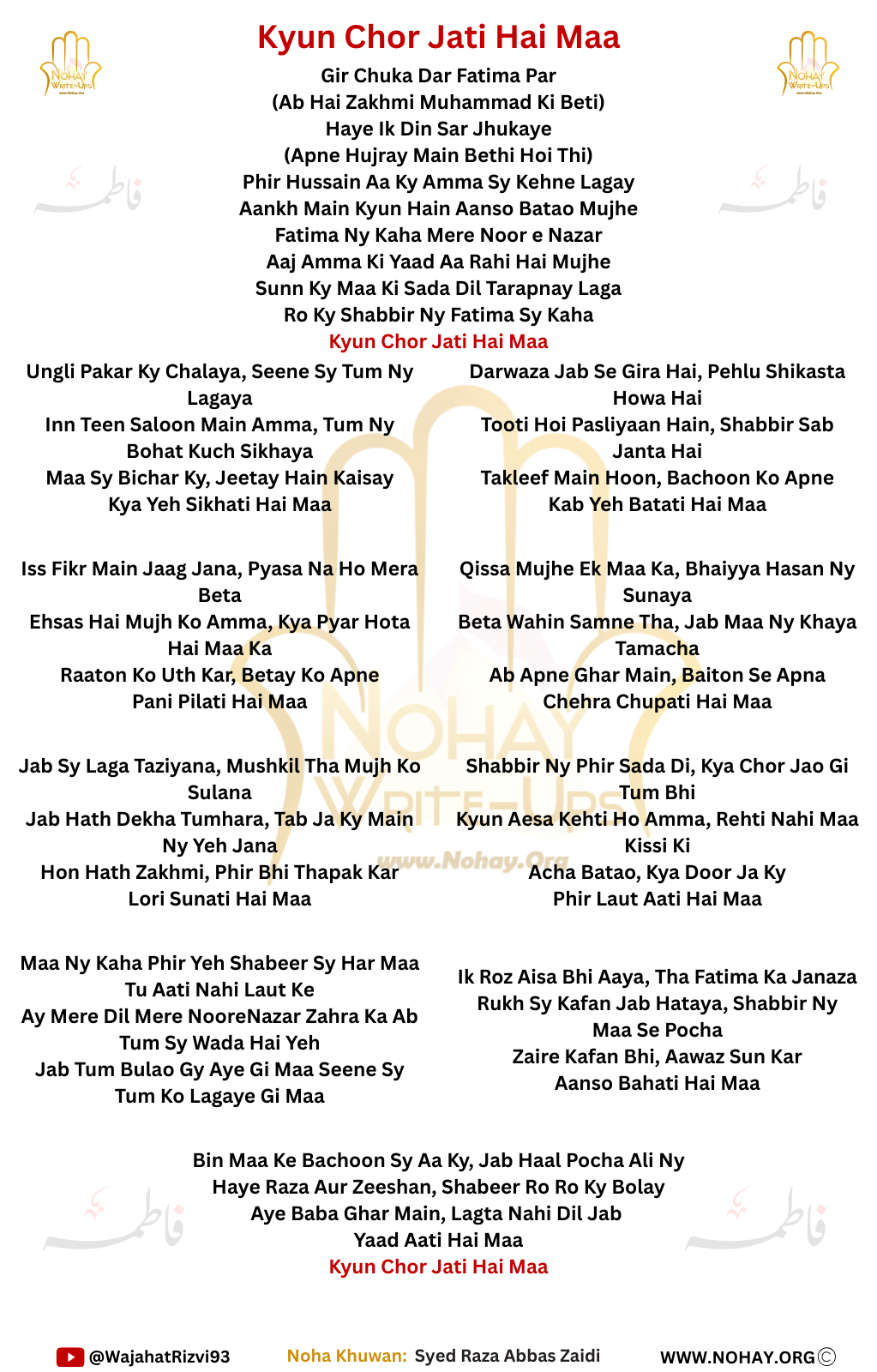 Kyun Chor Jati Hai Maa | Bibi Fatima | Syed Raza Abbas Zaidi | Ayyam e Fatmiyah Noha 2023 | Lyrics